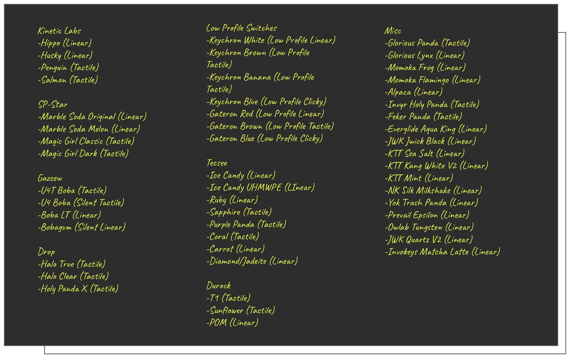 A switch tester with your choice of assorted switches! Clear keycaps and a map with names for every switch are included. Perfect for getting a feel for your ideal switch!